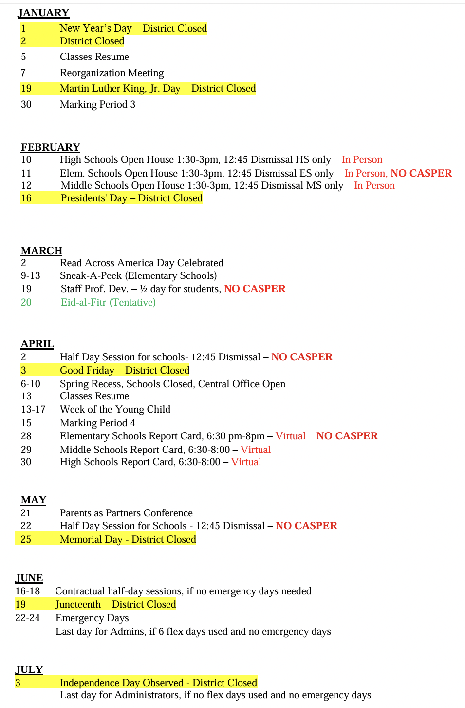District Calendar 2024-25